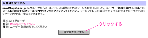 | 2.ホームページでの登録 下記のホームページから、登録の残りを完了してください。 http://www.egroups.co.jp/confirm.cgi?email=あなたのメールアドレス&id=00000 |